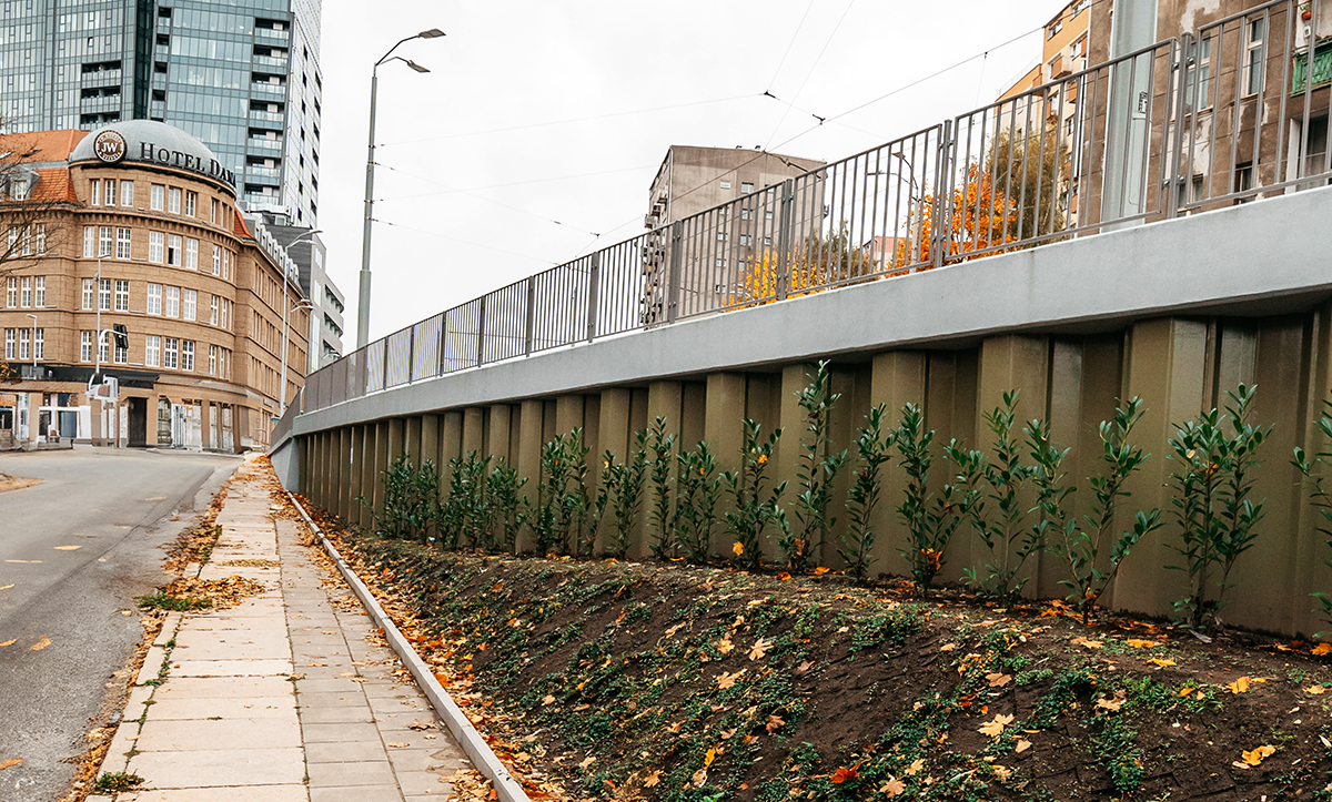 Prace wykończeniowe objęły również humusowanie nowej skarpy oraz wykonanie nasadzeń roślinnych, które stanowią naturalny element zabezpieczający grunt przed erozją, a jednocześnie wpływają na poprawę estetyki otoczenia i integrację konstrukcji z krajobrazem miejskim.